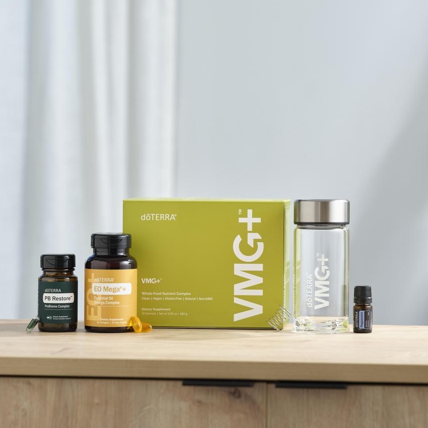 I take this every morning! doTERRA’s Foundational Wellness Bundle! VMG+ powder packet (vitamins, minerals and Greens, the omegas, and PB Restore (pre,pro, post biotic) every day, and honestly… I just feel so good. My body actually craves it now! Plus, it tastes amazing, which makes it so easy to stay consistent. I feel more energized & balanced.